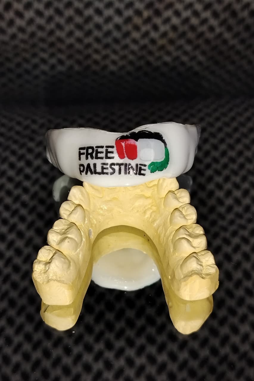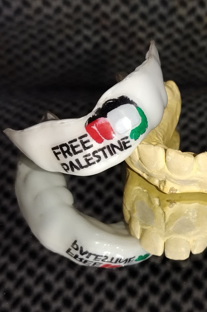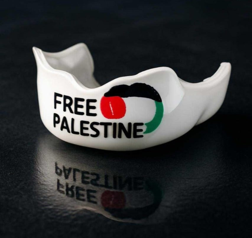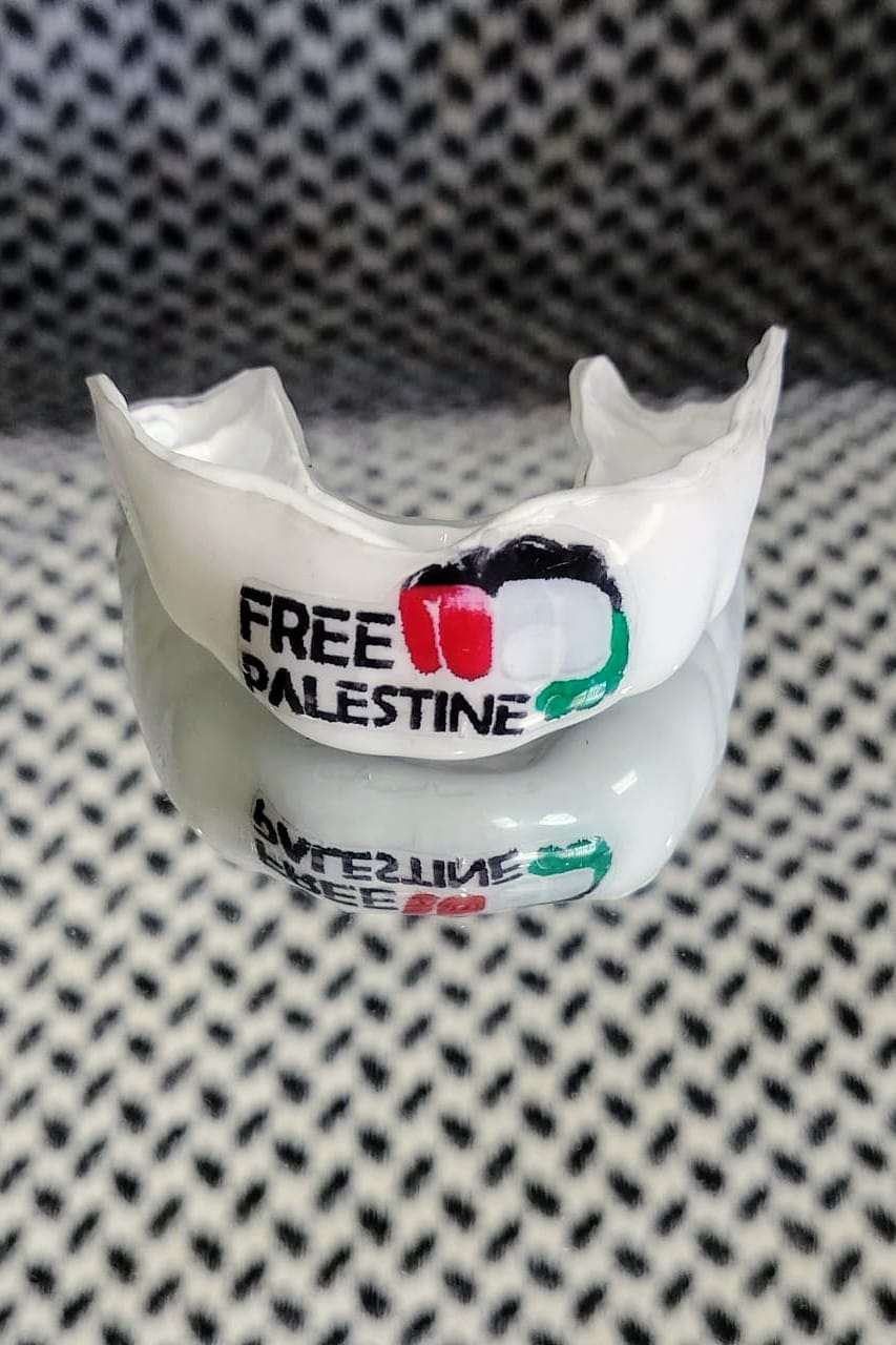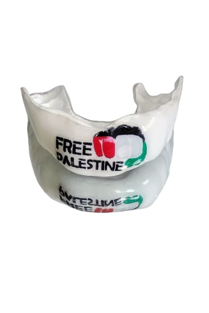 This custom-fit mouthguard proudly features the colors of the Palestinian flag — black, white, red, and green — along with the bold message “FREE PALESTINE” across the front. More than just a sports accessory, this design is a statement of solidarity, resistance, and identity.